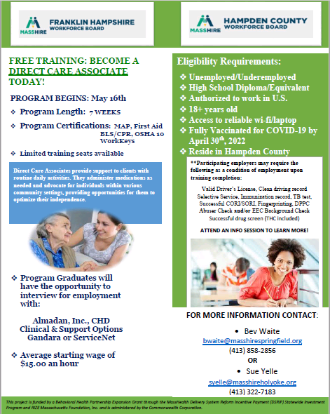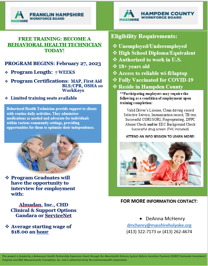 A number of specialized assistance and training programs are available to eligible customers to help them obtain marketable skills and move on to careers in mostly high demand occupations. To learn more about opportunities available through the Workforce Innovation and Opportunity Act, Trade Adjustment Act, and other programs, such as those that provide support and benefits for Veterans or people living with disabilities, registered MassHire Holyoke customers should attend a Training Opportunities Workshop offered virtually on alternate Wednesdays at 1:00pm. Eligible customers will learn how they might receive financial assistance, when funding is available, to enter occupational and on the job training programs that last one year or less and lead to full time employment. After attending the Training Opportunities workshop, customers will meet with a Career Counselor to learn more about these programs.
